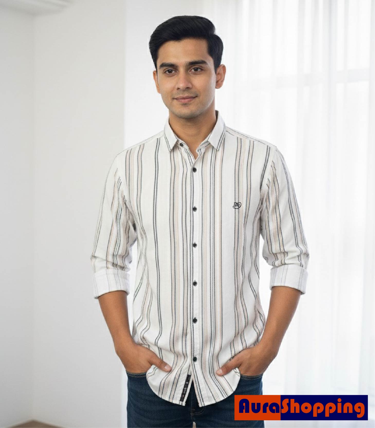 Close-up/Mid-section studio photograph of a man wearing a full-sleeve casual shirt. The shirt is off-white or cream and features thin vertical stripes in multiple subtle colors, including black, grey/taupe, and a hint of light brown/peach. It has contrasting dark (likely black) buttons. The sleeves are rolled up slightly, and the man stands casually with his hands in his pockets. The background is soft, light, and minimalist.