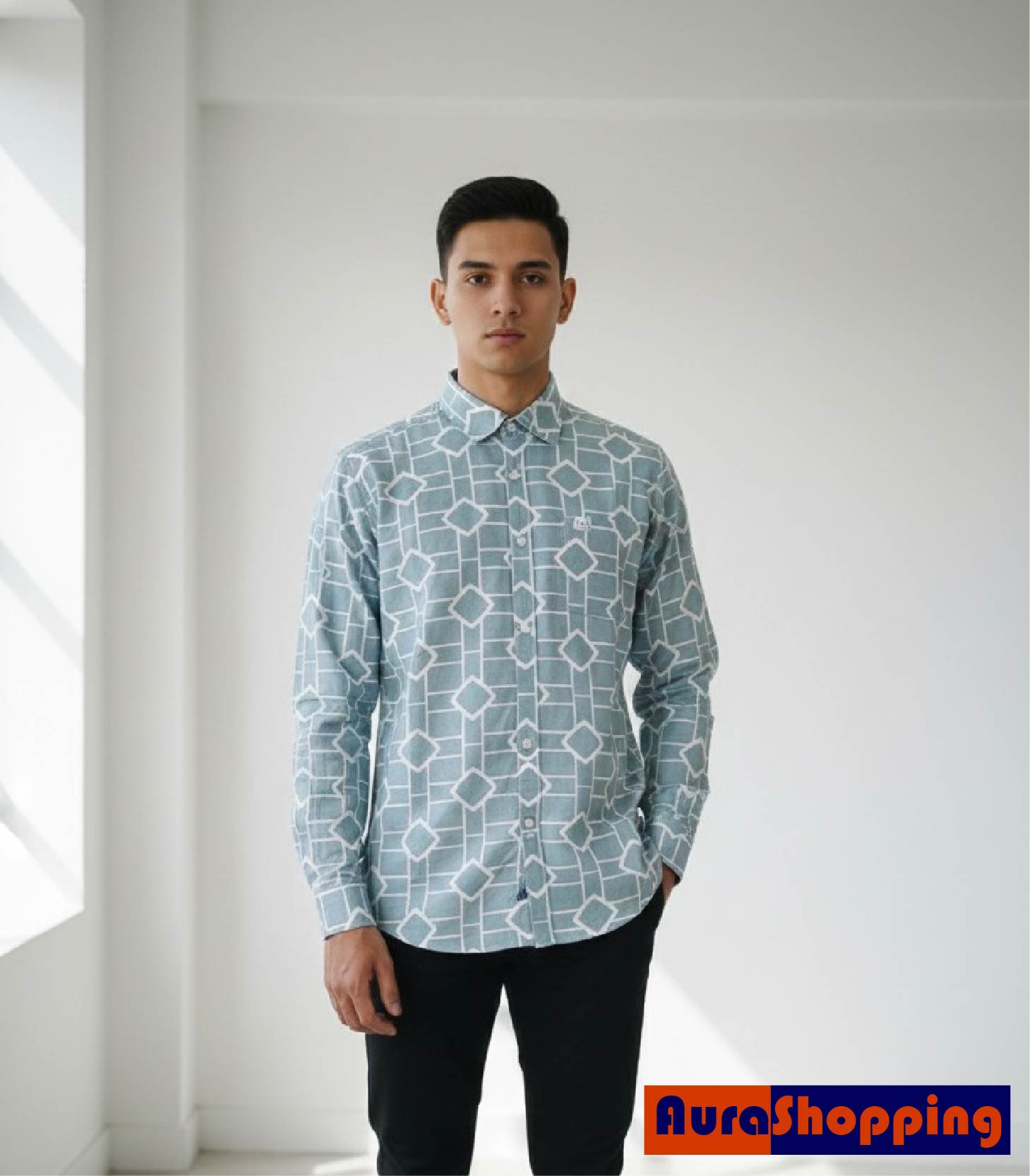 Mid-shot, man in teal geometric print shirt
